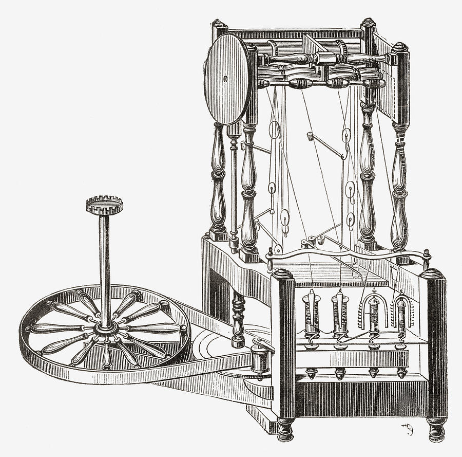 They did not, however, forbid the import of raw cotton. And so, a domestic cotton cloth industry slowly developed, despite the combined cost of importing fibers by ship and then paying expensive British workers to turn it into cloth.[2] Meanwhile, slowly, over the course of the eighteenth century, several entrepreneurs figured out new ways to improve the efficiency of the production steps required to turn raw fibers into cloth. For example, John Kay’s fly shuttle of 1733, which allowed a single artisan seated at a loom to sweep the bobbin holding the weft yarn from one side of the warp to the other with a quick flick of the wrist. By eliminating the need for an assistant on either side of the loom to pass the shuttle back and forth, this invention reduced the cost of making British broadcloth.