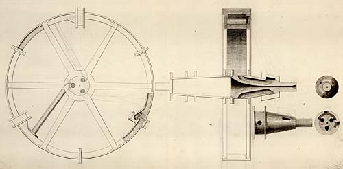 Though it required prompting from Boulton to get Watt moving on the rotative engine, he did not lack for ideas on the subject. His interest in rotary motion went all the way back to his initial impetus for thinking about steam engines in the first place – his friend James Robison’s notion that a steam engine might be used to drive a carriage, rather than horses. The idea of solving the problem of rotary motion remained in his mind, and in parallel with the reciprocating steam pump design that made him famous, Watt had designed a very different kind of engine specifically to do so. He called it the steam wheel.