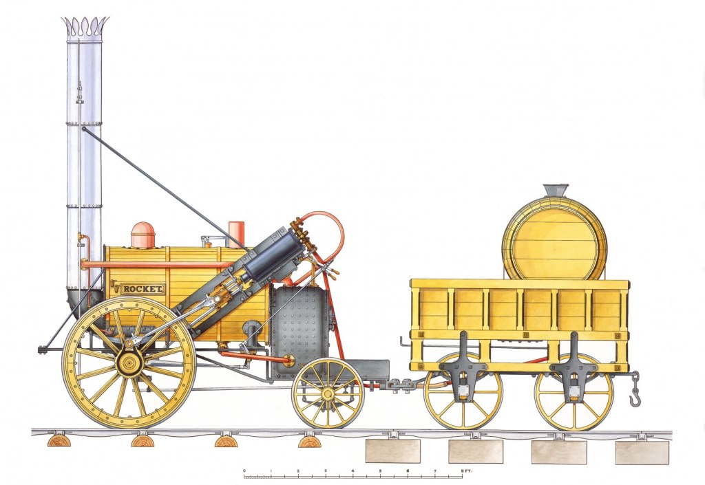 The winning entry, however, came from George’s son, Robert. After returning from his mining ventures in the New World in 1827, he had apprenticed in locomotive construction under his father. But he built his own masterwork, Rocket, for the Liverpool and Manchester. Its great design advance lay in its multi-tubular boiler: rather than a single return flue pipe, it had twenty-five separate copper tubes to carry the hot gases from the firebox through the boiler. This greatly increased the surface area to transfer to the boiler. The narrower tubes also eliminated a serious problem with the steam blast: its tendency to suck burning embers straight out of the firebox along with the exhaust, wasting fuel.