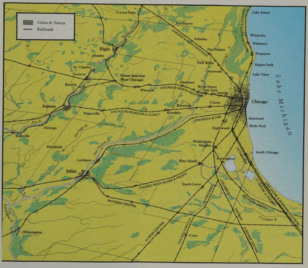 Rivers and harbors had given life to many a great metropolis over the millennia; Chicago was the first to be quickened by rails. Not that water had nothing to do with it: Chicago’s small river ran close to the watershed of the Illinois River, giving it huge potential as a water link that could connect shipping flows on the Mississippi River system to the Great Lakes (and thus, via the Erie Canal, New York, the commercial nexus of the entire country). In the 1830s, Chicago was still a muddy little trading entrepot, its hinterlands recently wrested from the Potawatomi Indians, but a speculative real estate bubble took off on the assumption that it would explode in importance once a canal was built to connect the two water systems.[16]