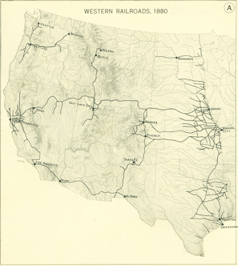 North America became a continent bound by steam; to the detriment of some but the great good fortune of others. By 1880, a rail traveler in Omaha could reach not just Sacramento, but also Los Angeles, Butte, Denver, Santa Fe, and El Paso. By 1890, the white population spreading along these rails had so completely covered the West that a distinct frontier of settlement ceased to exist.[25]