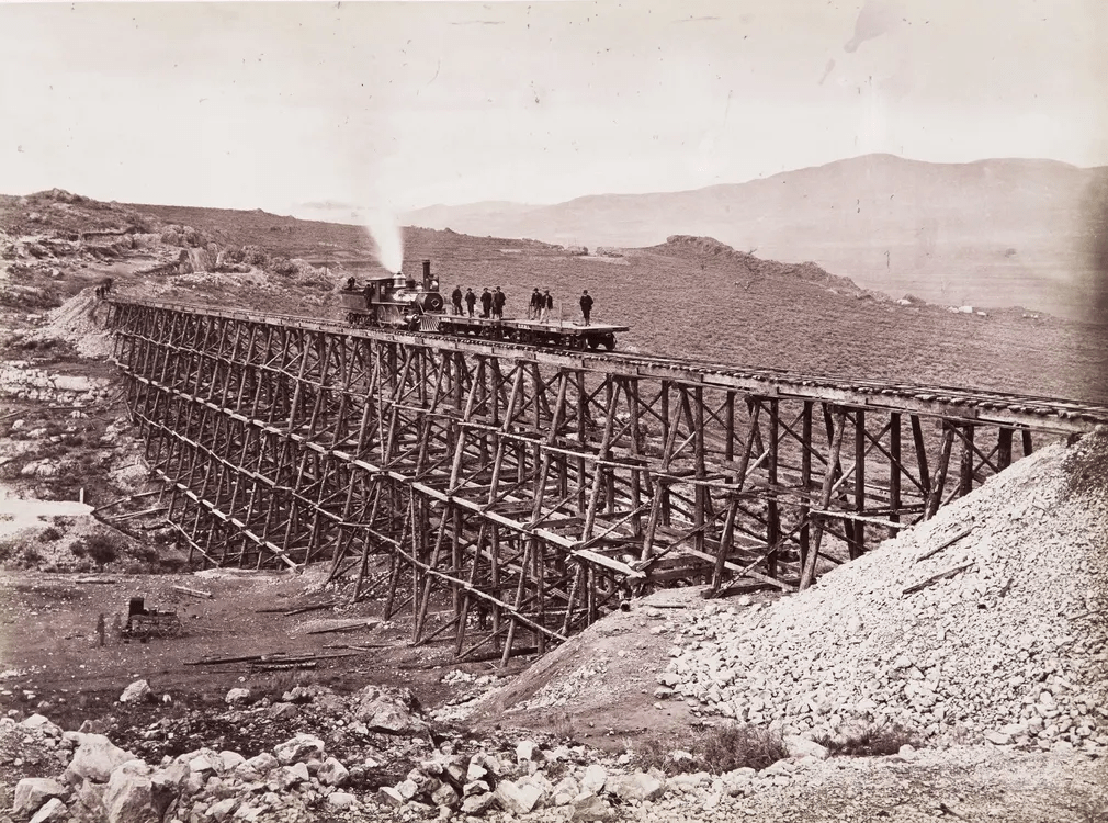 A scrappier approach would be needed to make railways work in this context. Cheap construction trumped all other factors. In the early years, builders frequently resorted to flimsy “strap-iron” rails, consisting of a thin veneer of iron nailed to a wooden rail. They avoided expensive tunnelling or levelling operations to cross hills or mountains in favor of steeper gradients and tighter curves: by 1850, the U.S. had dug only eleven miles of railway tunnels compared to eighty in Britain, despite having several times Britain’s total track mileage by that point, much of which crossed mountainous terrain. As rails moved westward, American rail builders figured out how to construct bridges of timber trusses, a material readily available in the heavily wooded Ohio Valley, rather than iron or heavy stone construction like the Thomas Viaduct.[9]