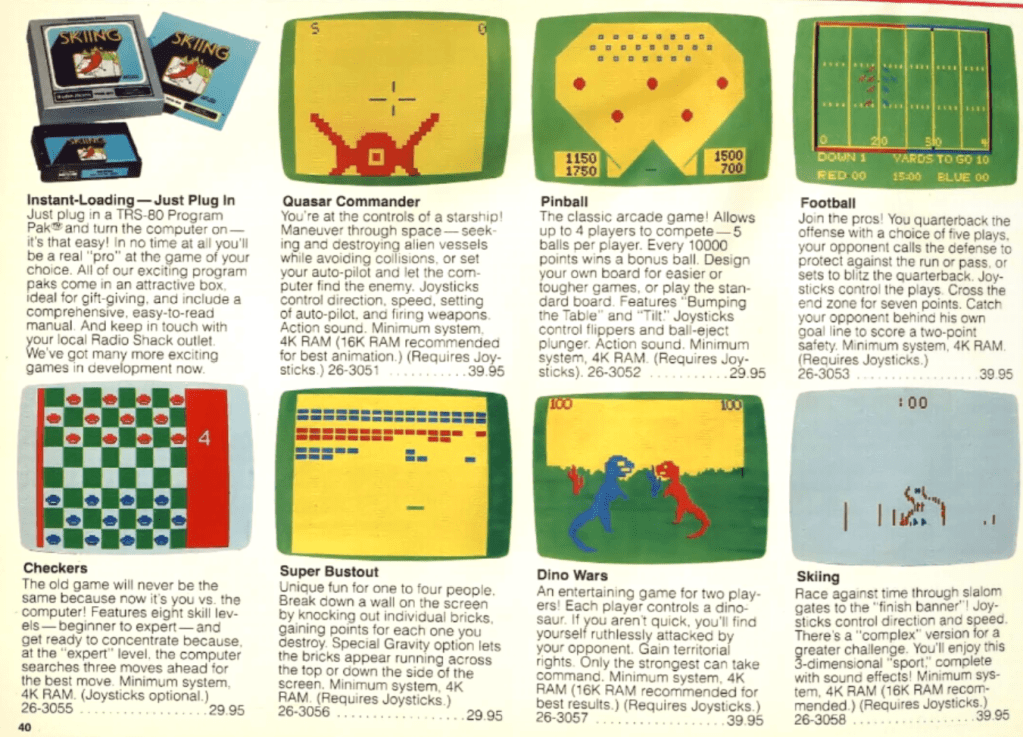 The Color Computer came in two versions, a $399 model with four kilobytes of RAM, and a $599 model with sixteen kilobytes and a more feature-rich BASIC interpreter. The price point was attractive enough, but this was not a computer to set the world on fire. The four-color graphics and single-channel sound paled in comparison to what TI and Atari offered, and the low-quality joysticks (they did not “self-center”) worked poorly for many arcade-style games. And then there was the dearth of software to consider. Radio Shack held to its strategy of forbidding third-party software from their stores unless they licensed it through Radio Shack, who took a substantial percentage (if they agreed to the license at all). This discouraged software developers from authoring Color Computer software, and at launch there were only a handful of Radio-Shack-authored titles available (mostly games, of course).[5]