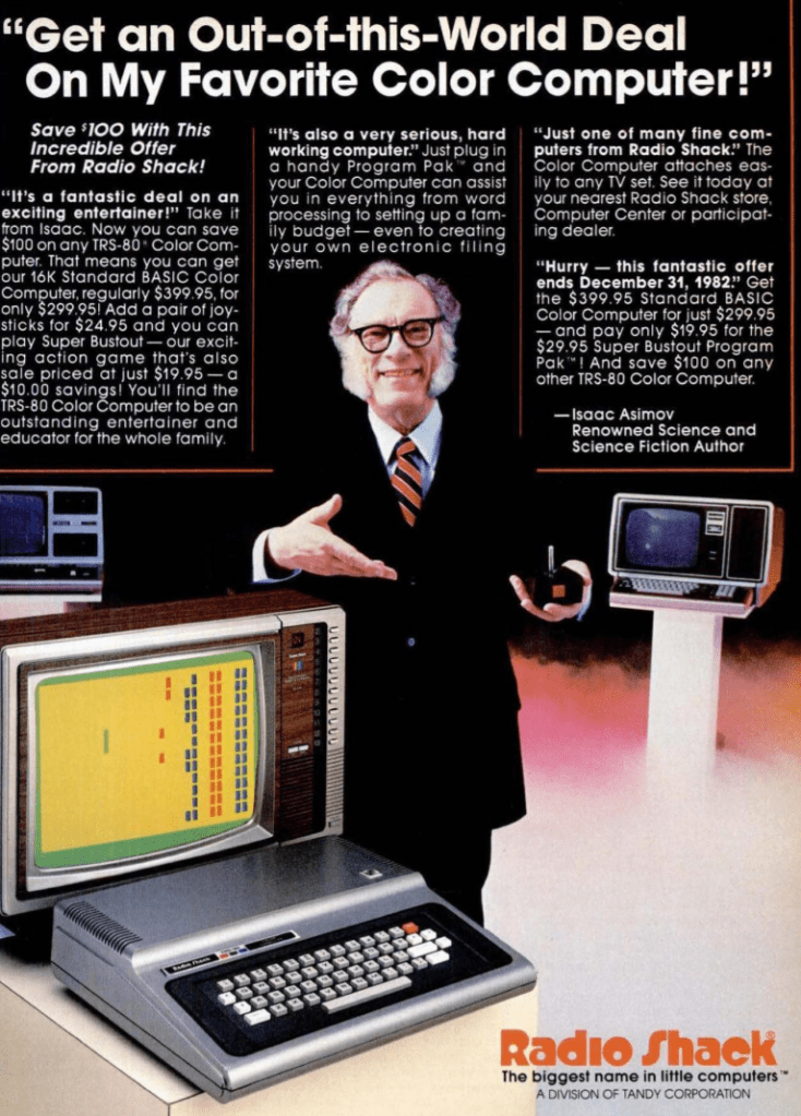At first, it was a marketing war. In order to convince the everyman and everywoman that the computer was an approachable and easy-to-use appliance, not the forbidding monstrosity of popular imagination, each brand enlisted a well-known spokesman to put a friendly face to their product. They appeared in full-page color magazines ads and in national television spots. Both Tandy and Commodore went for the sci-fi angle, to emphasize the forward-looking nature of their product (and, presumably, its users). Prolific author Isaac Asimov, a TRS-80 user, became the pitchman for the Color Computer, while Kit Spencer recruited Star Trek actor William Shatner for the VIC-20 (Leonard Nimoy was already taken by Magnavox). Commodore certainly came out ahead: Asimov’s horn-rim glasses and mutton-chop sideburns made him look more like a relic of the past than a herald of the future, while Shatner was about to rocket to a new stratum of fame as star of a summer 1982 blockbuster, Wrath of Khan.[15]